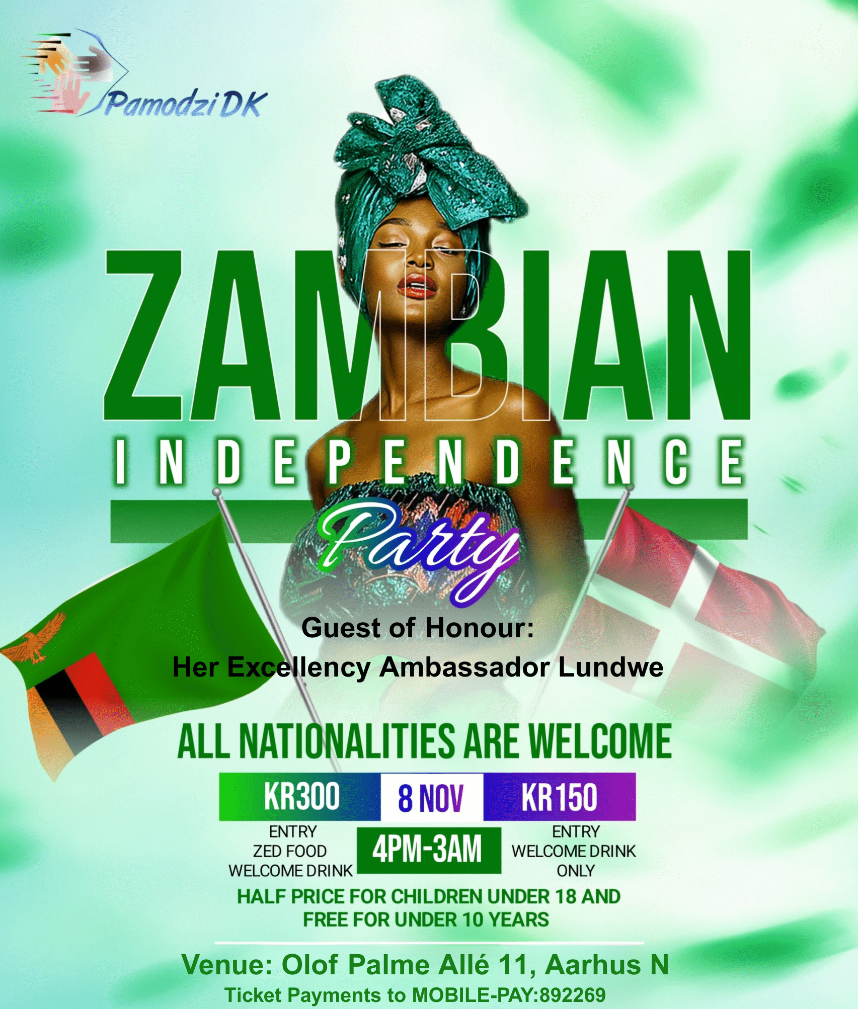 Celebrating Independence Day in Aarhus will be more than a commemoration of history; it promises to be a heartfelt gathering that unites people from all walks of life. Join us on the 8th November in Aarhus at Olof Palme Allé 11D from 16:00hrs to 02:00hrs for this special celebration. The event offers a wonderful chance to share and embrace Zambian culture, strengthening connections within the community and beyond. With lively music, authentic traditional cuisine, and an energetic atmosphere, you’ll get to immerse yourself in the richness of Zambian heritage, unity, and friendship. Don’t miss this chance to connect, celebrate, and create unforgettable memories—everyone is welcome!